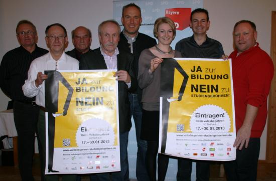 5.v.l.: Landtagsdirektkandidat Peter Stranninger, 2.v.r.: Marktgemeinderat Martin Kreutz „Ja zur Bildung. Nein zu Studiengebühren!“ So lautet das Motto, mit dem ein breites Bündnis von Parteien, Gewerkschaften und vielen gesellschaftlichen Gruppen und Verbänden für das von den Freien Wählern (FW) auf den Weg gebrachte Volksbegehren zur Abschaffung der Studiengebühren wirbt. Der Bayerische Verfassungsgerichtshof hatte das Volksbegehren gegen den massiven Widerstand der CSU zugelassen. Um eine Volksabstimmung herbeizuführen, müssen sich zehn Prozent der Wählerinnen und Wähler in Bayern in den Rathäusern in die Listen eintragen und mit ihrer Unterschrift das Volksbegehren unterstützen. Aktuell sind die notwendigen Unterschriften noch nicht erreicht. Der SPD-Ortsverein Mallersdorf-Pfaffenberg und Landtagsdirektkandidaten Peter Stranninger unterstützen das Volksbegehren und rufen gemeinsam zum Endspurt bis Mittwoch, den 30.01.2013 auf.