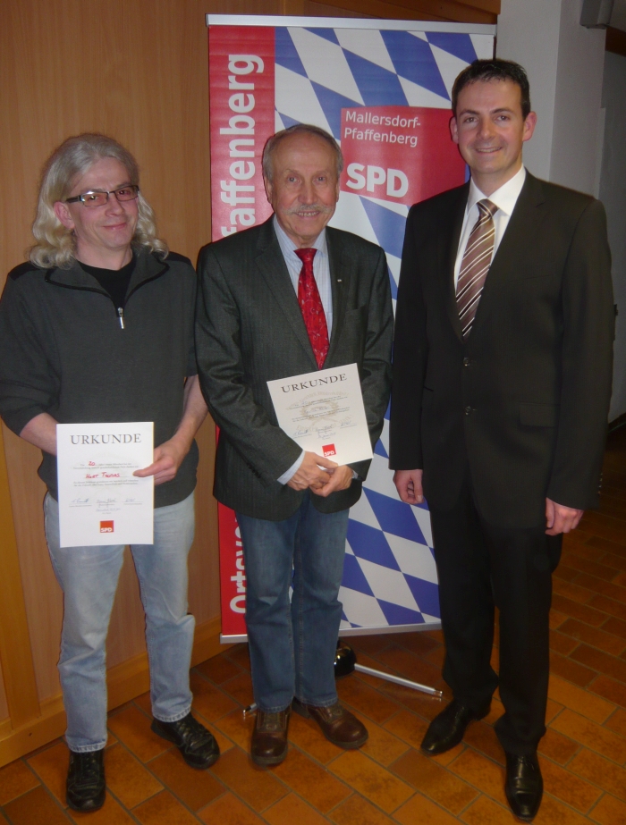 Am Sonntag hat der SPD-Ortsverein Mallersdorf-Pfaffenberg im Sportheim Oberlindhart Jahresabschluss gefeiert. Als Höhepunkt wurden Heinrich Kaiser für 40 Jahre und Thomas Hort für 20 Jahre Mitgliedschaft geehrt. Im Anschluss stimmte Ortsvorsitzender und 3.?Bürgermeister Martin Kreutz auf das bevorstehende Jahr ein, das ganz im Zeichen der Nachwahl zum Kreistag am 1. Februar stehen wird.